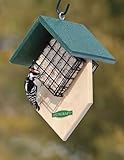 Duncraft , Protected suet feeding! Our double suet feeder has a large, overhanging roof to protect suet from rain, snow and hot sun. The roof is made of recycled plastic, a beautiful, durable material that never warps, fades or cracks. Two suet baskets are mounted on a wooden base for double sided feeding. The base also serves as a tail prop for larger woodpeckers that use their tails to balance while feeding. Holds 2 standard suet cakes. Natural wood and green, recycled plastic. Roof is 8 x 8 inches, feeder is 7 x 13 inches tall. ...